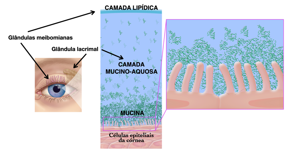 Figura 1: Ilustração esquemática do filme lacrimal e seus componentes: Uma fina camada de gordura (lipídica) produzida pelas glândulas meibomianas que estão ao longo das pálpebras), camada aquosa mais volumosa produzida pela glândula lacrimal (contém água, eletrólitos, elementos bactericidas, anticorpos, fatores de crescimento, mucina dissolvida) e a camada de mucina produzida por células que estão na superfície da conjuntiva (células caliciformes). (Adaptado de Gayton JL. Etiology, prevalence, and treatment of dry eye disease.Clinical Ophthalmology 2009:3 405–412.)